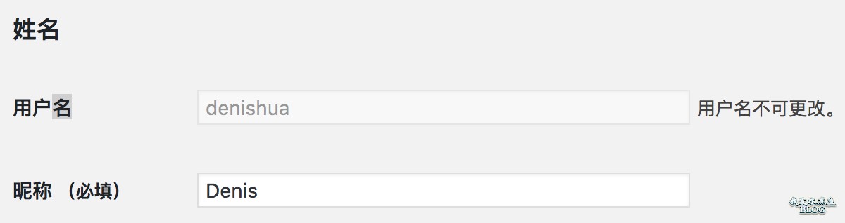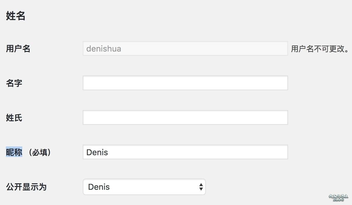其实只是用来写写博客,很少的编辑会填这么多的东西,所以最好的方法就是把他们隐藏起来,看了一下 WordPress 源代码,名称设置这里竟然没有 filter,没有filter 那就用 JS 来隐藏,然后提交的时候,把显示的名称强制设置为昵称就好了。
