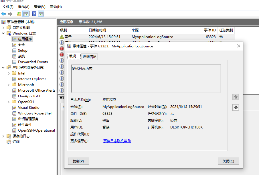 EventLog.WriteEntry("MyApplicationLogSource", "测试日志内容",EventLogEntryType.Warning,100010);运行后到事件查看器查看写入的日志