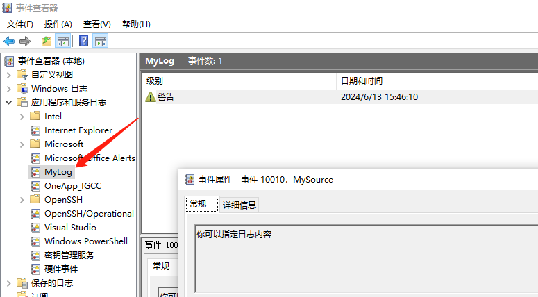 EventLog.WriteEntry("MySource", "你可以指定日志内容", EventLogEntryType.Warning, 10010);运行后,可以看到增加了一个MyLog日志,并增加了一条类型为警告的记录