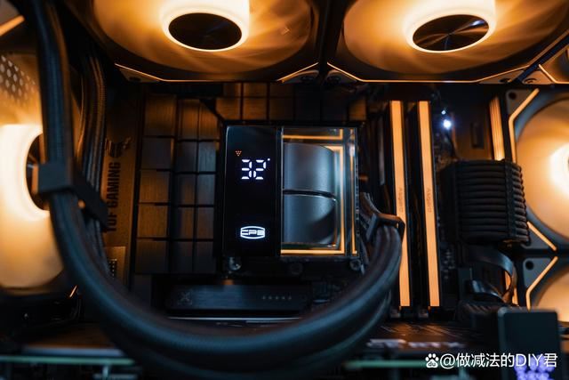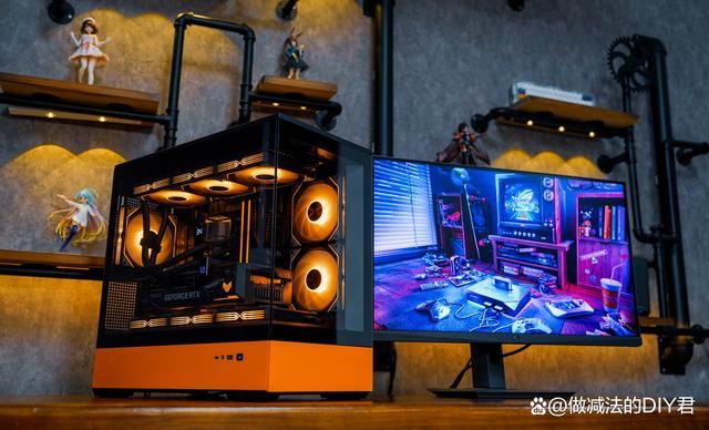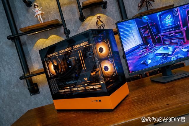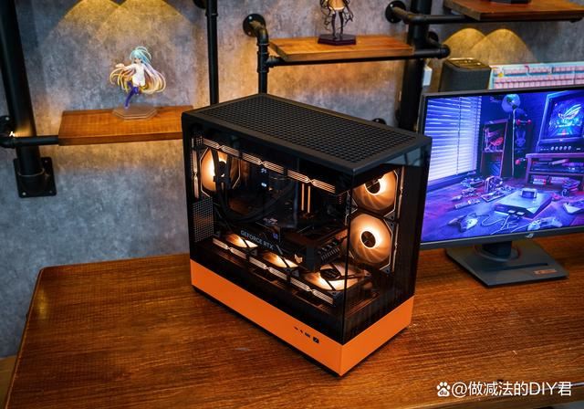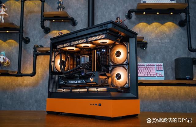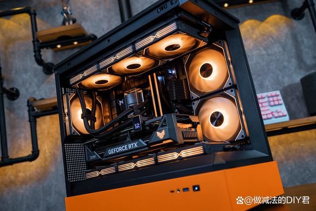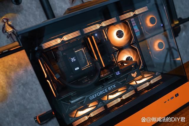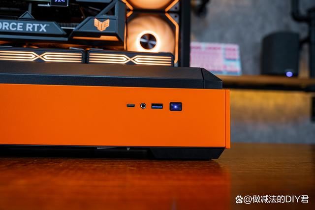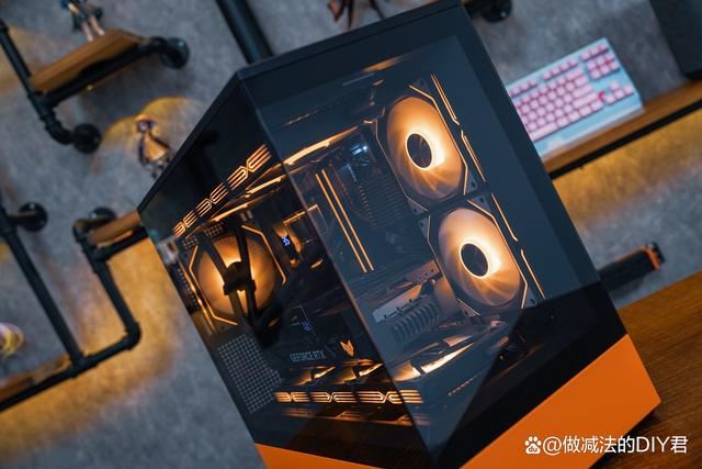 整机展示就是把直观的装机思路最直接的展现出来,黑色箱体依然是占主导百搭的箱体主配色,要是觉得主机太过单调的话,不妨尝试下和这次的拼色箱体可能你会有一种耳目一新的发现。所以在展示部分也分为两部分:外和内。外观采用的是黑橙拼色的机箱设计搭配上恰如其分的灯效来点缀衬托让整体在观感层次上确实有其亮眼之处。