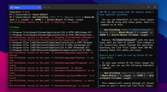 AI Shell 可以回答用户提出的各种问题,例如查找特定大小的文件、生成 Python 代码等。它能够根据用户需求提供相应的 PowerShell 脚本或 Python 代码,并根据用户反馈进行调整和优化。
