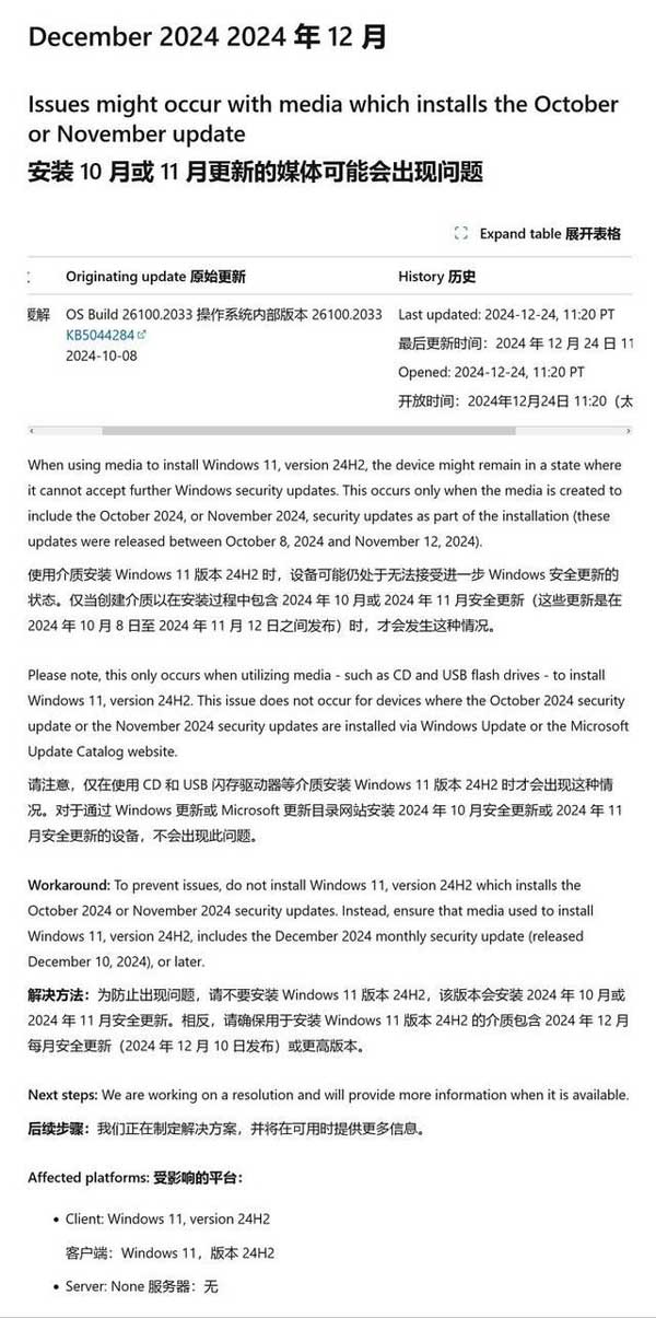 微软公司于 12 月 24 日更新支持文档,承认用户如果使用优盘或者磁盘安装含有 10/11 月安全更新的 Windows 11 24H2 系统,可能导致 Windows Update 功能无法正常使用。