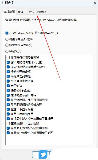 4、随后,在性能选项窗口中,切换到“数据执行保护”选项栏。
