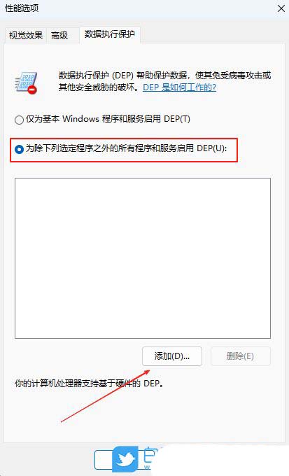 5、此时,勾选下方的“为除下列选定程序之外的所有程序和服务启用DEP”,并点击“添加”选项,添加自己信任的、不需要DEP保护的程序,随后点击应用确定后重启电脑即可。