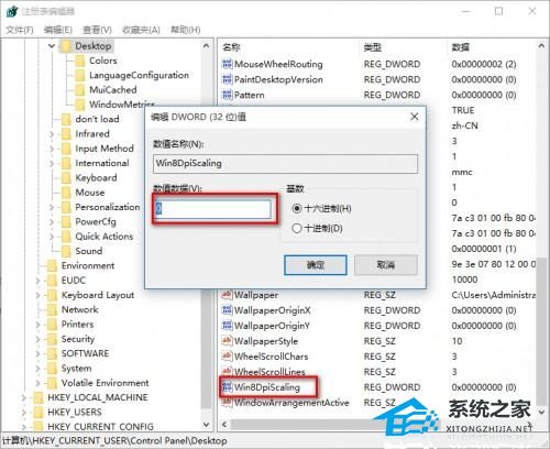 3. 找到Win8DpiScaling,将数值数据修改为1(如下图)。