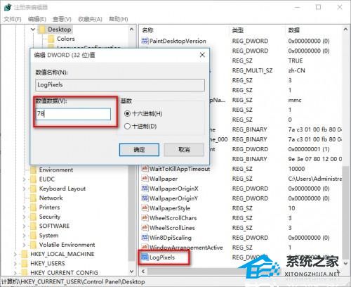 4. 找到LogPixels(如果没有就新建一个“DWORD (32位)值”,命名为LogPixels),将LogPixels修改为所需放大的百分比数值,注意十六进制与十进制的转换(括号内为十进制的放大百分比,括号外为十六进制的放大数值,例如想放大到120%,就填写78):78(120%),7D(125%),96(150%),C8(200%),如下图。