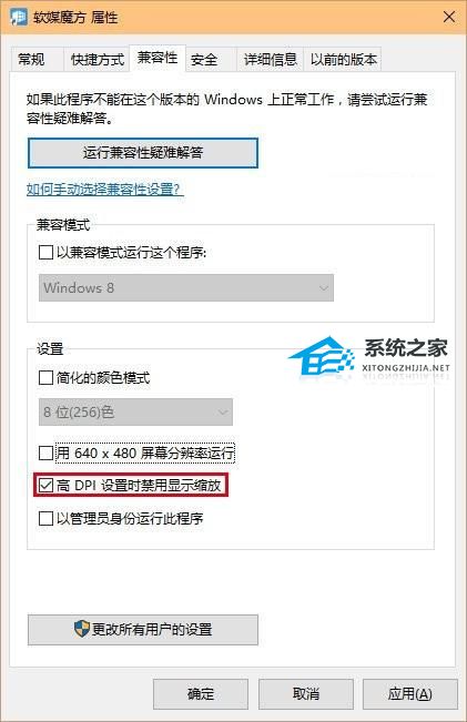 2. 点击“兼容性”,勾选“高DPI设置时禁用显示缩放”,点击“确定”(如上图)。