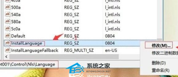 6、返回之后再找到InstallLanguage,还是右击选中修改。