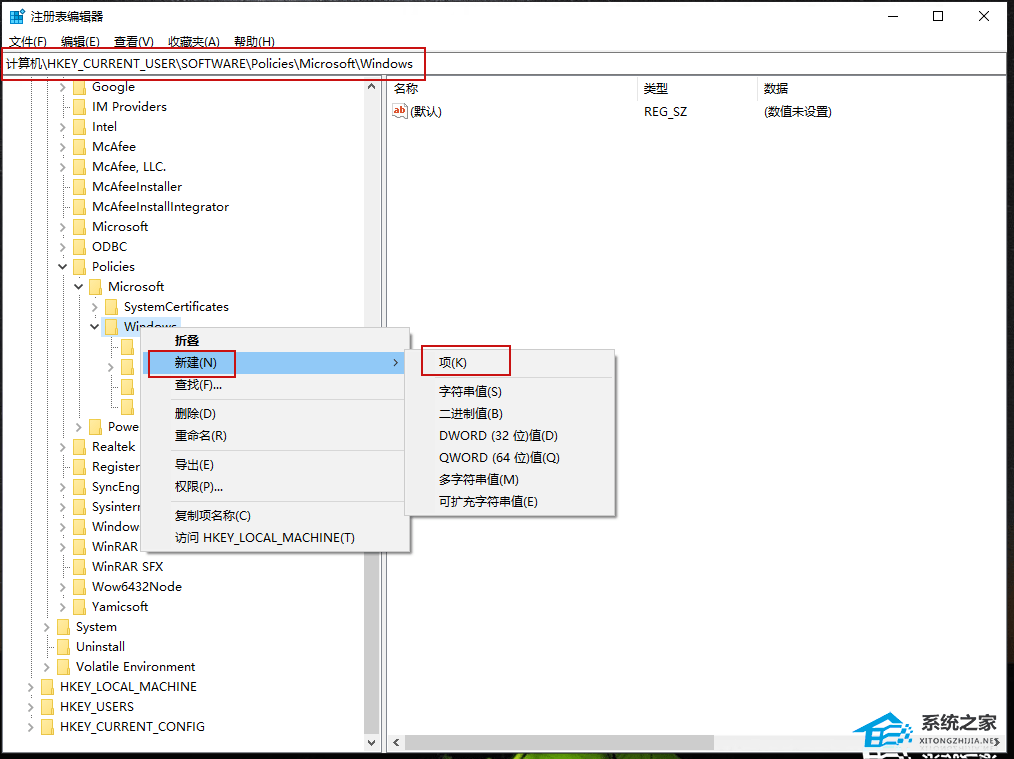 2、定位到:计算机\HKEY_CURRENT_USER\Software\Policies\Microsoft\Windows