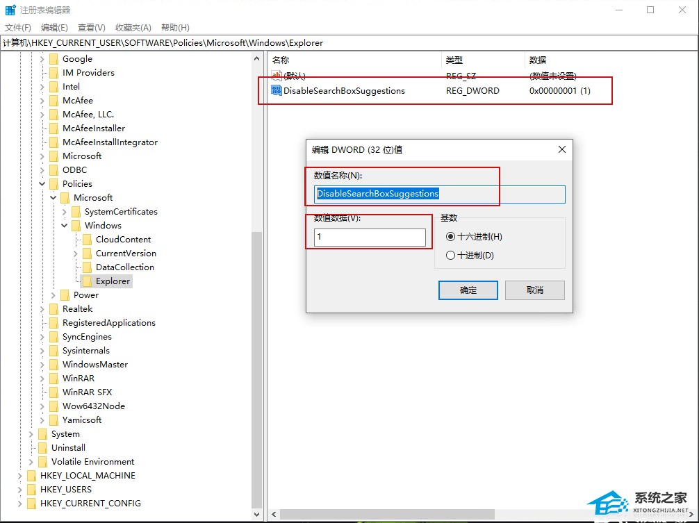 4、再在新建的“Explorer”项中新建一个“DWORD (32)值”,命名为:DisableSearchBoxSuggestions,数值设置为“1”。注意: 0 为(开启)。