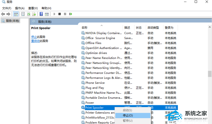 2、服务窗口,找到名称为【Print Spooler】服务,并点击【右键】,在打开的菜单项中,选择【停止】;