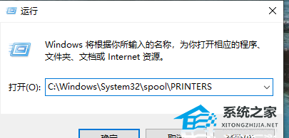 3、这时候,再打开运行(Win+R),输入【C:\Windows\System32\spool\PRINTERS】,按【确定或回车】;