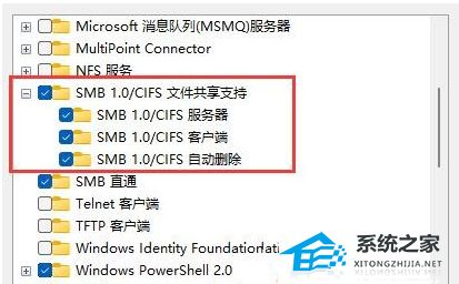 5、最后,找到并勾选【SMB 1.0/CIFS 文件共享支持】,再点击【确定】保存即可。