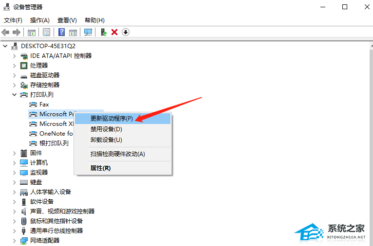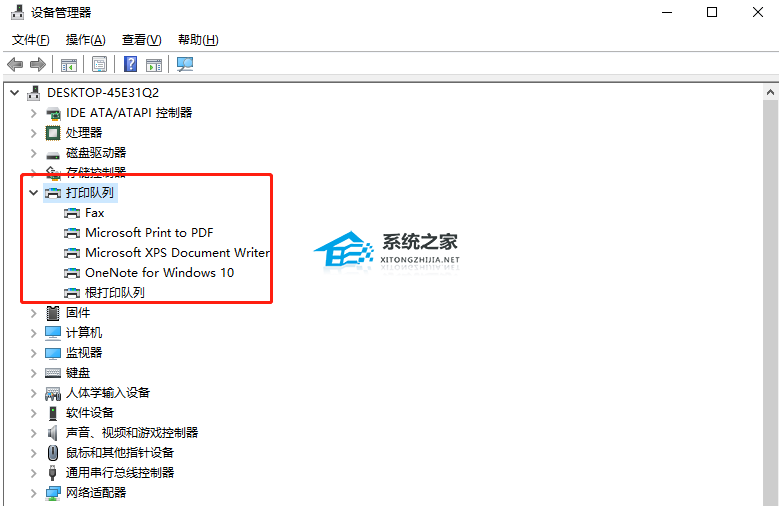 2、设备管理器窗口,在打印机队列中,找到并选择【有问题的打印机】;