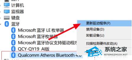 3、找到【Qualcomm Atheros Bluetooth】并鼠标右键,选择【更新驱动设备】。