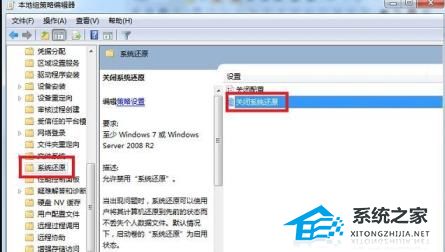 2、进入本地组策略编辑器窗口后,在左侧依次展开“计算机配置--管理模板--系统--系统还原”,在右侧双击打开“关闭系统还原”策略(如图所示)。
