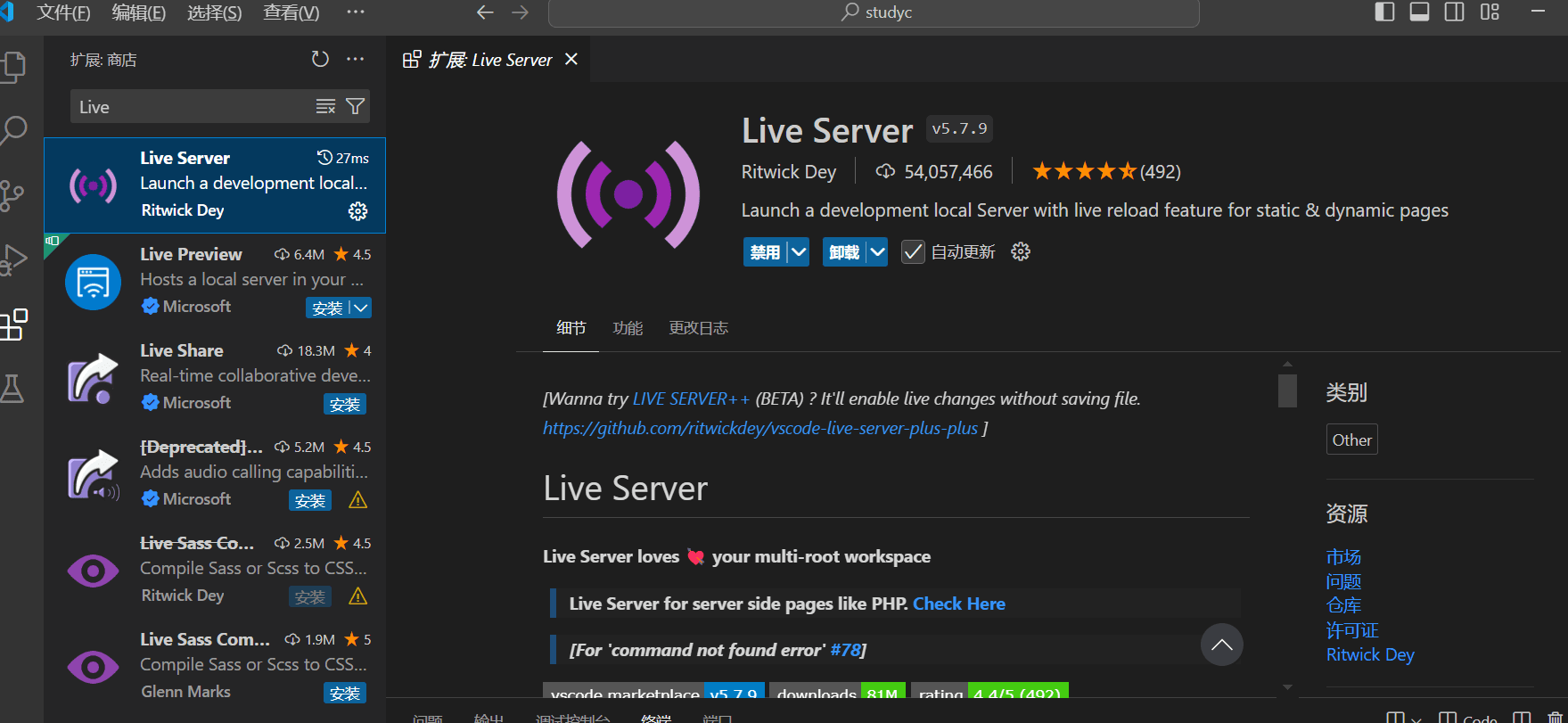 3.打开vs code,安装两个插件,分别是Live Server和Code Runner,其中Live Server可以支持在vs code中构建轻量级web服务器,运行html前端代码,Code Runner支持一键运行JavaScript代码。