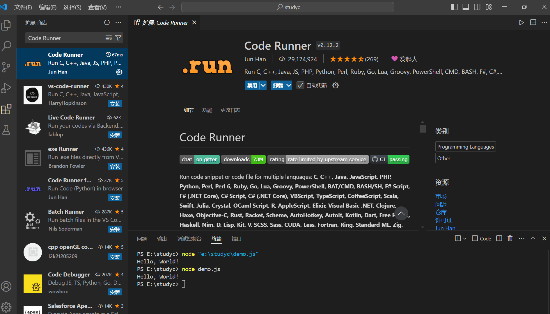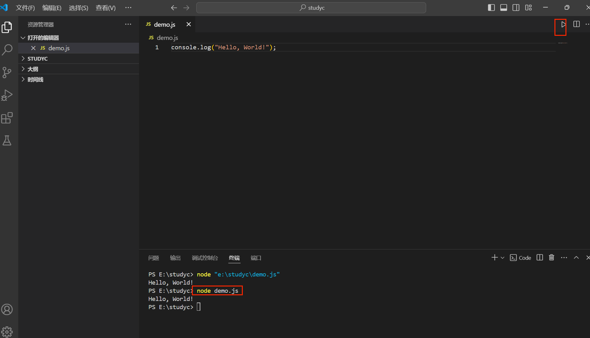 点击右上角运行,或在终端输入node demo.js,运行程序,可在终端获得输出结果。