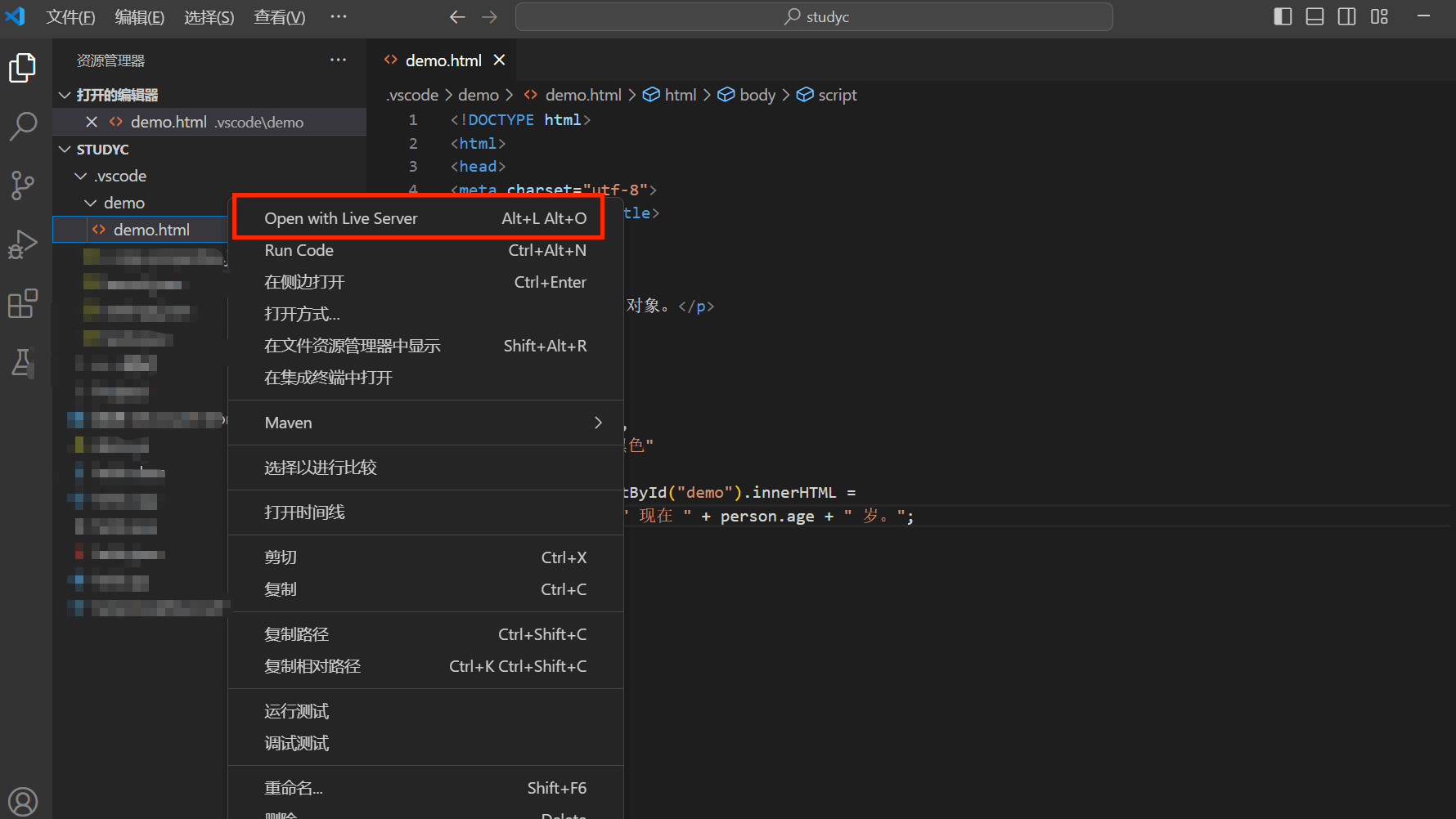 右键文件名,选择“Open with live Server”,即可在浏览器中获得演示效果。