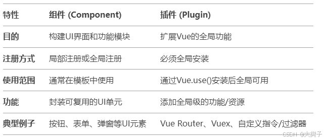 this.$router) - 抽象层次不同:组件关注UI实现,插件关注功能扩展