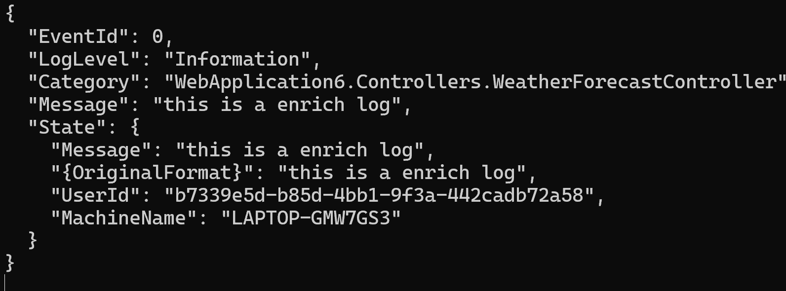 我们将创建一个简单的IStaticLogEnricher,将当前计算机名称添加到日志中,另外创建一个ILogEnricher,将当前用户Id添加到日志中。