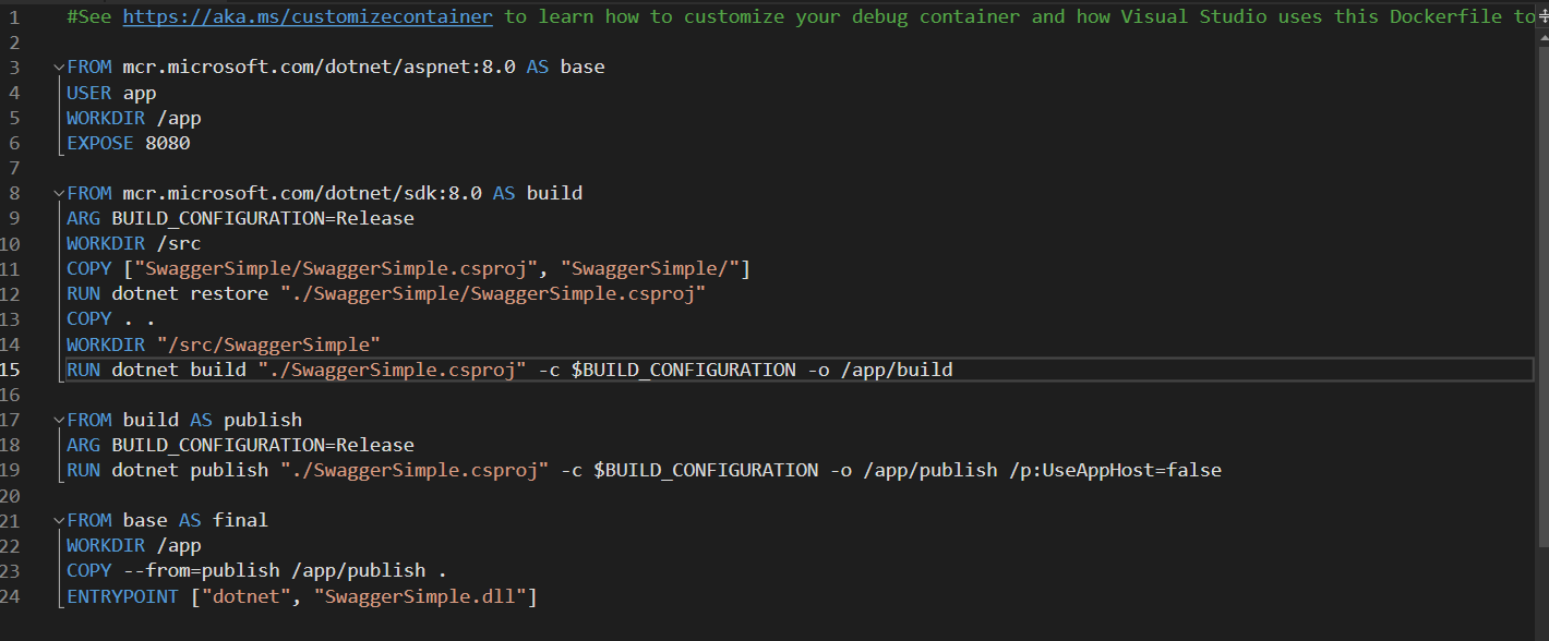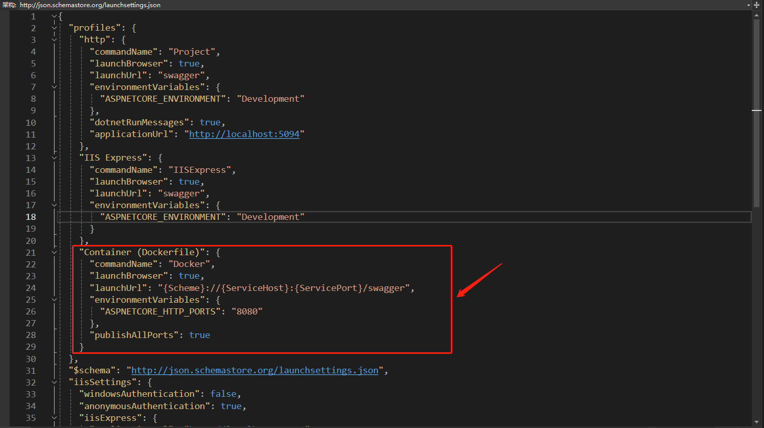 需要注意的是Dockerfile文件中的 EXPOSE 后方的端口需要与 PropertieslaunchSettings.json 文件中的 ASPNETCORE_HTTP_PORTS 指定端端口一致,该端口在部署到 docker 后,将作为容器端口使用。