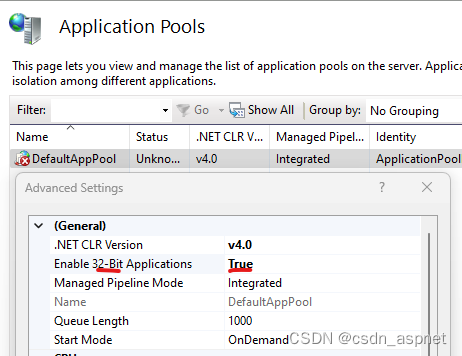 要检查您的池是否在 x86 上运行,请验证inetmgr控制台,验证高级设置...并检查启用 32 位应用程序是否设置为true。