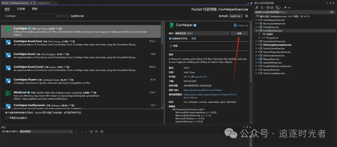 NuGet包管理器中搜索:CsvHelper,点击安装!