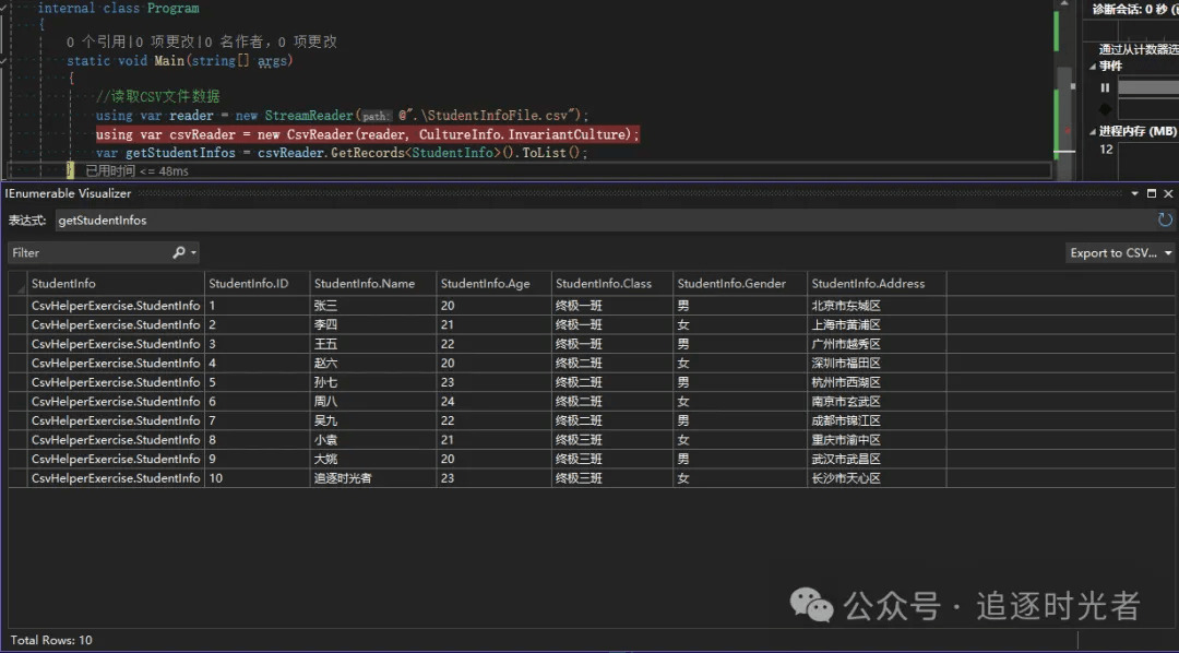 new StudentInfo { ID = 10, Name = "追逐时光者", Age = 23, Class = "终极三班", Gender = "女", Address = "长沙市天心区" }