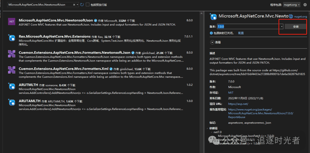 在.NET 3.0及其以上的版本使用Newtonsoft.Json需要通过安装 Microsoft.AspNetCore.Mvc.NewtonsoftJson 包来进行配置(注意假如提示该包安装失败可以尝试安装其他版本的包)。