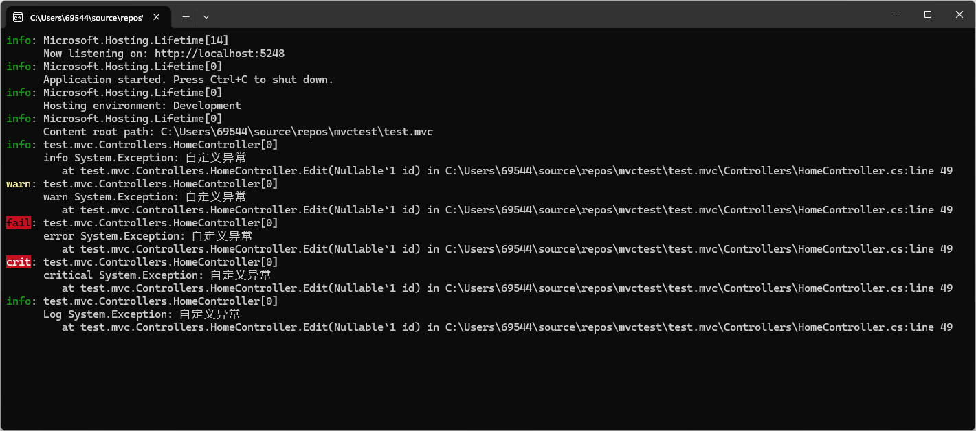 });碰到异常打印日志是正常操作,所以这不需要我们去关心。但是,在前面的截图中,UseExceptionHandler中间件的异常打印的问题在于,没有打印请求路径、请求参数等信息。我们只知道哪里出错了,却不知道是什么原因引起的,怎么复现,这是很不完善的。不知道当初为什么这样设计。所以最好是自己重新写个异常处理中间件,设置响应内容以及控制日志打印。