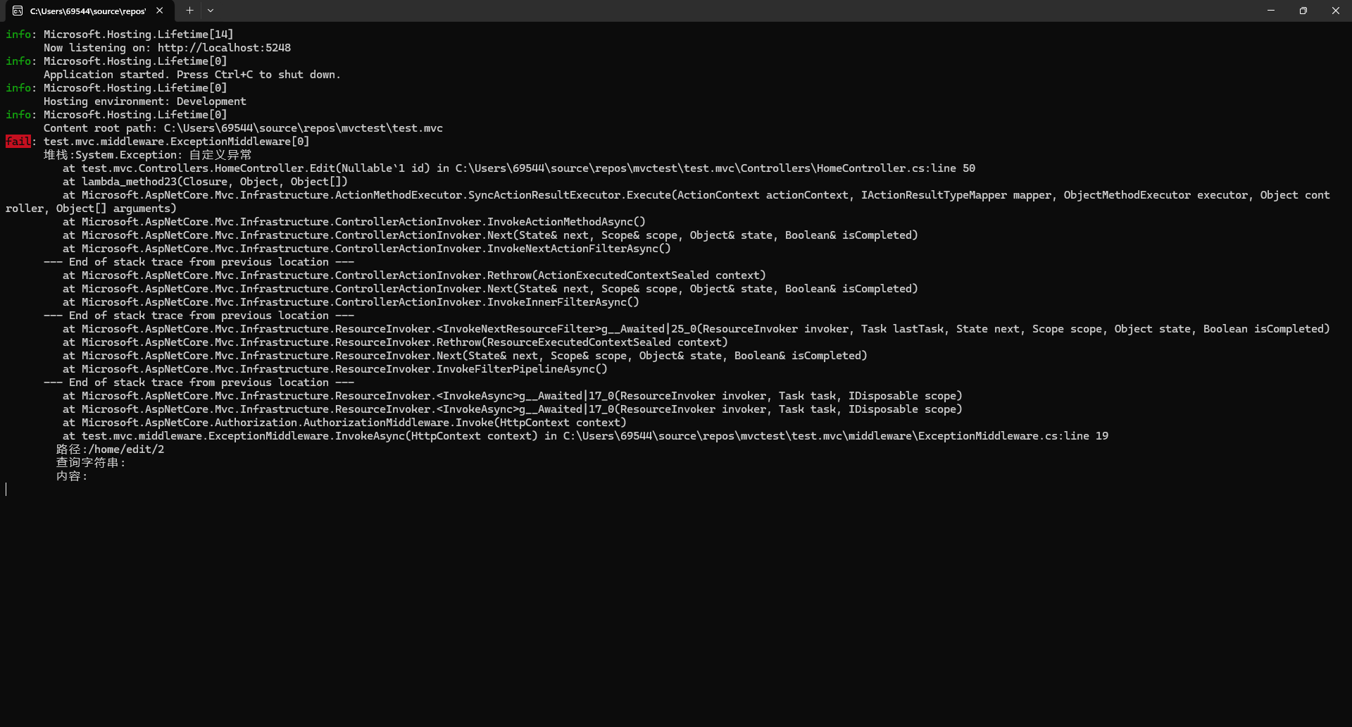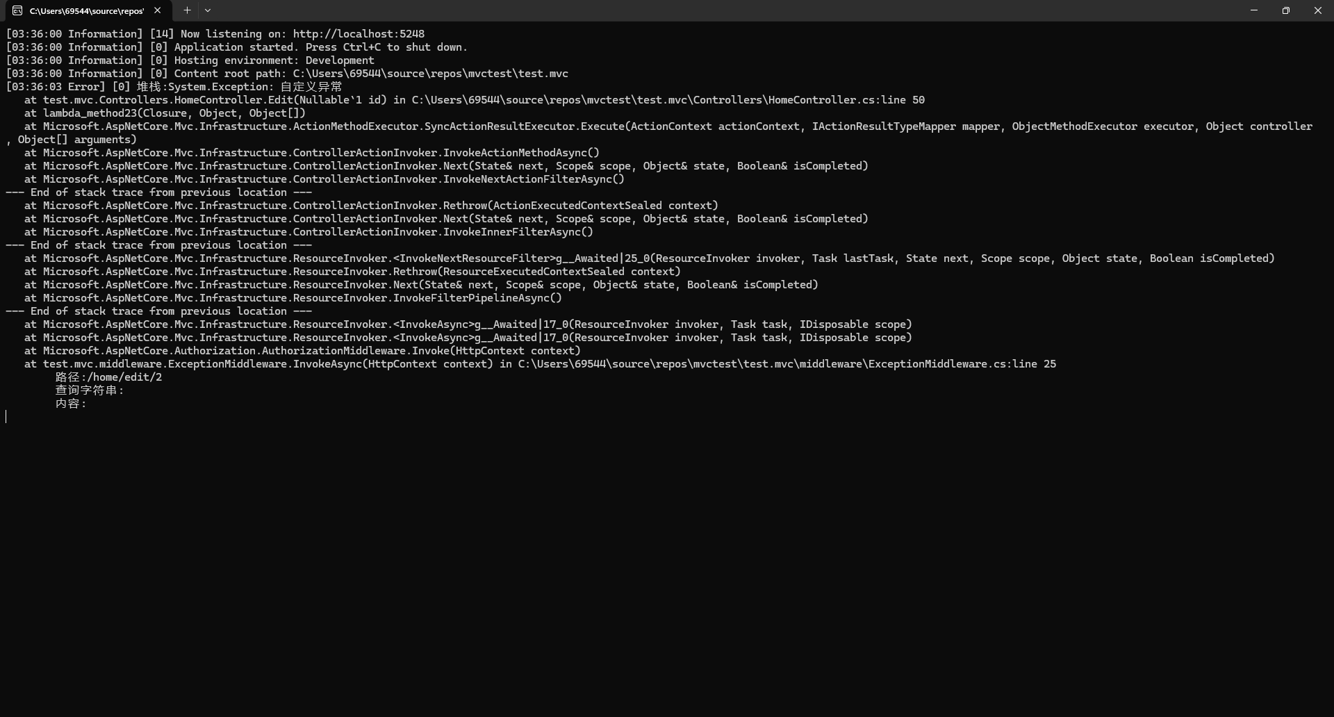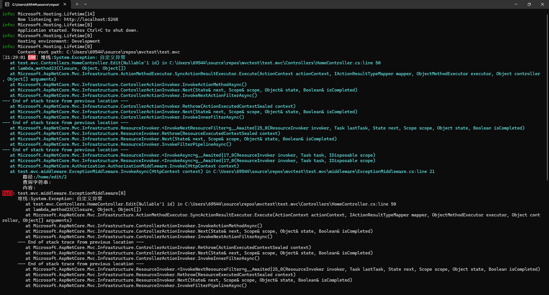 我注意到,不管使用UseDeveloperExceptionPage还是UseExceptionHandler中间件,控制台中都会出现异常日志,这是为什么?这是因为这两个中间件中都调用了日志打印。所以我们可以自己实现一个异常处理中间件,这样就不会打印日志了。