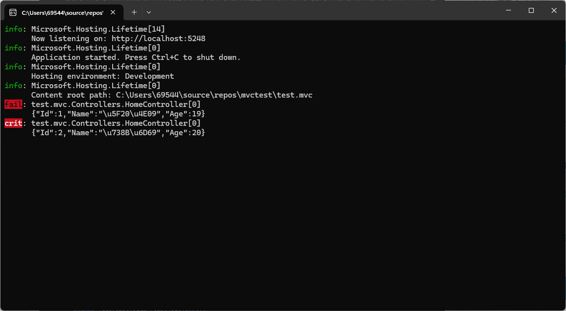 _logger.LogCritical("{path}", new Person() { Id = 2, Name = "王浩", Age = 20 });这里我在重写中调用了序列化方法,打印结果是一个json数据
