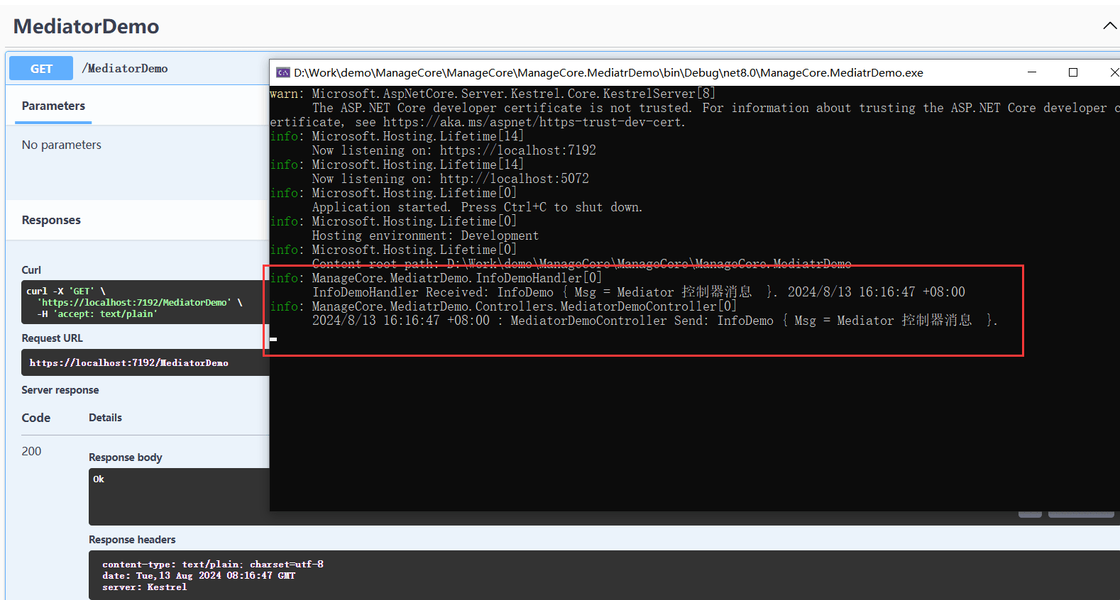 通过访问 /MediatorDemo的 GET 请求来调用MediatorDemoMethod方法。