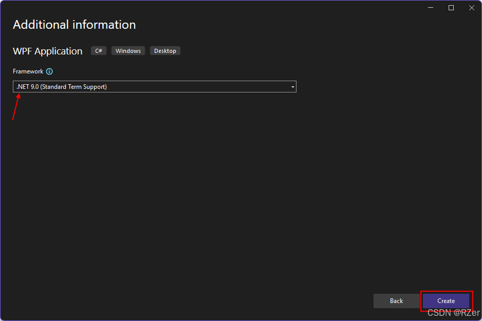 - 在"其他信息"窗口中,选择目标框架的 .NET 9.0(标准术语支持)。 选择"创建"按钮。