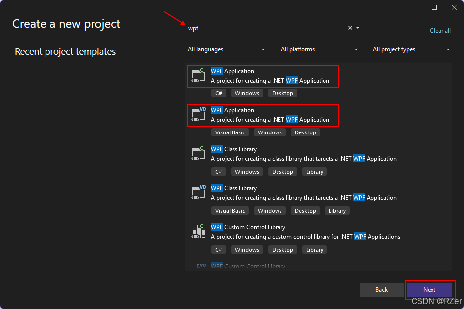 - 在"搜索模板"框中,键入"wpf",然后按 Enter。