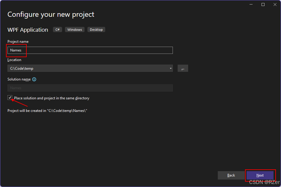 选中"将解决方案和项目放在同一目录中"复选框。