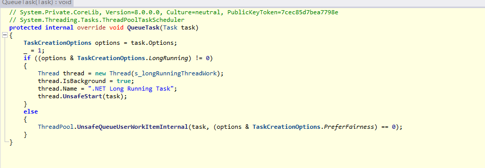 Task.Run(() => { { Console.WriteLine("Test"); } });其底层会自动调用Start(),Start()底层调用的TaskShedule.QueueTask().而作为实现类ThreadPoolTaskScheduler.QueueTask底层调用如下。