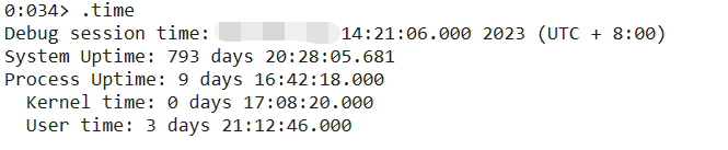 从卦中可以清晰的看到,提交内存是9G,同时Stack吃掉了3.5G,一般来说 Stack 不会有这么大,所以此事必有妖,在 TEB 中可以看到线程数高达 2405 个,这个确实不少哈,可以用 !t 做一个验证。