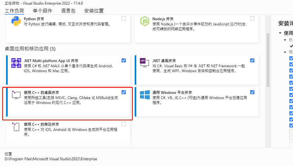 Desktop development with C++ workload 是一个工具集,里面包含 C++ 开发工具,需要在 Visual Studio Installer 中安装,如下图红框中所示。