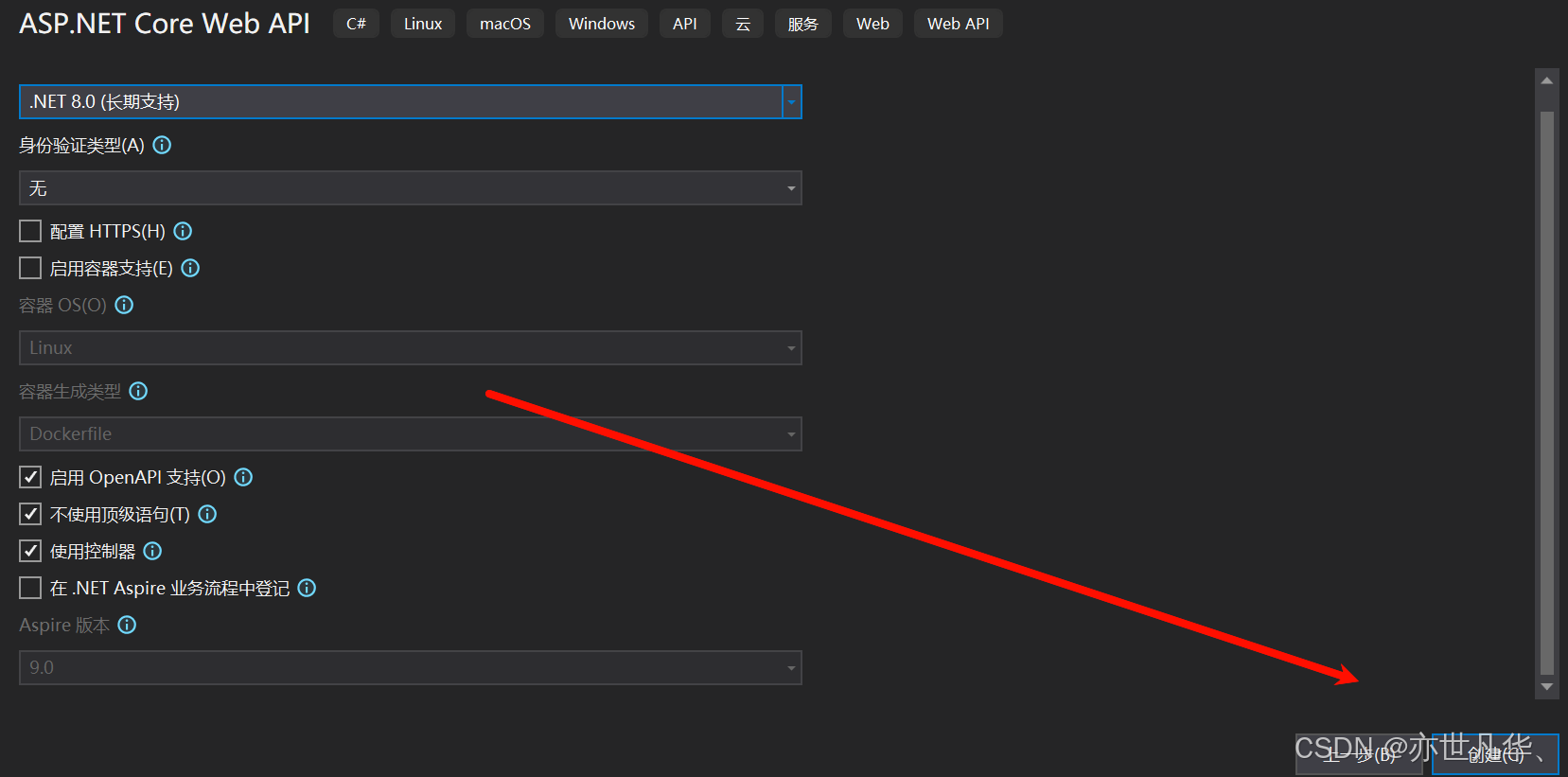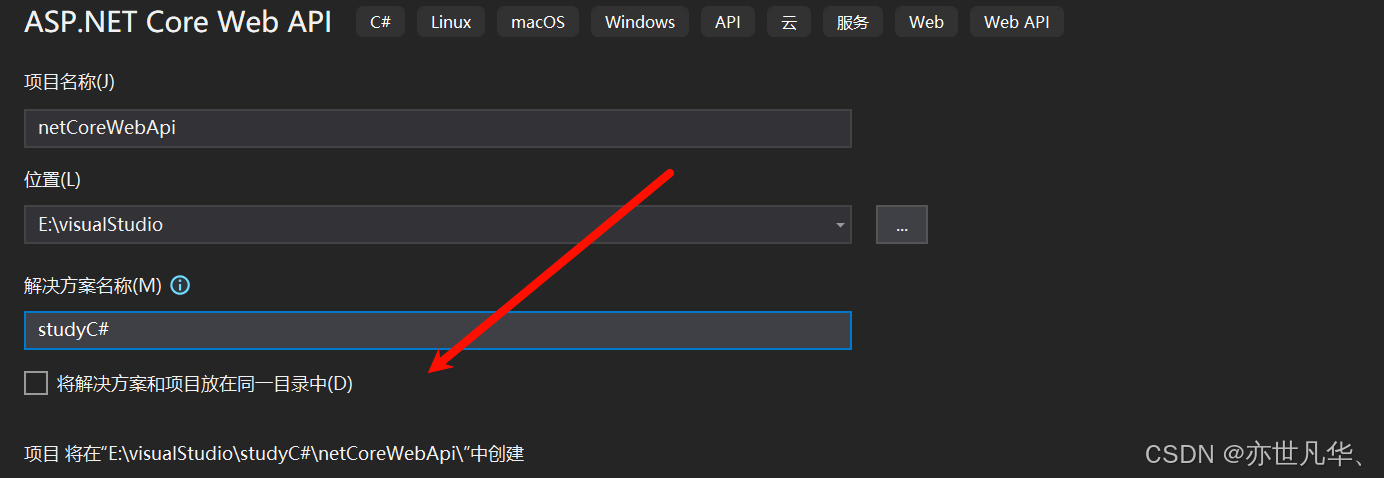 打开visual studio创建新项目,这里我们选择.net core web api模板,然后输入项目名称及其解决方案创建新项目