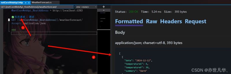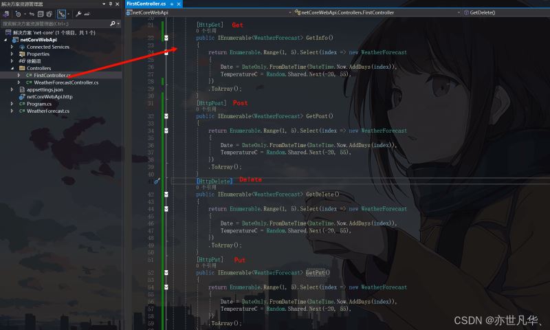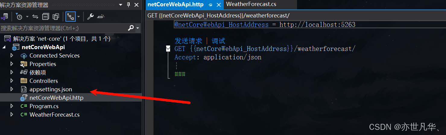 创建好项目之后我们可以看到 web api 模板运行的项目,相比于MVC模式开发的项目,初始文件是保留原有的控制器文件但是删除了模型和视图文件,而且还加上了两个文件,文件的作用相当于测试用例一一可以模拟发起请求,如下所示: