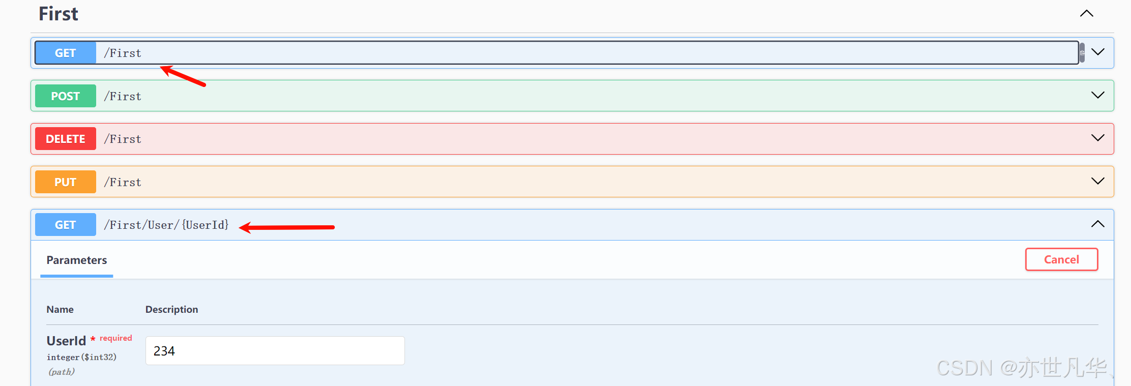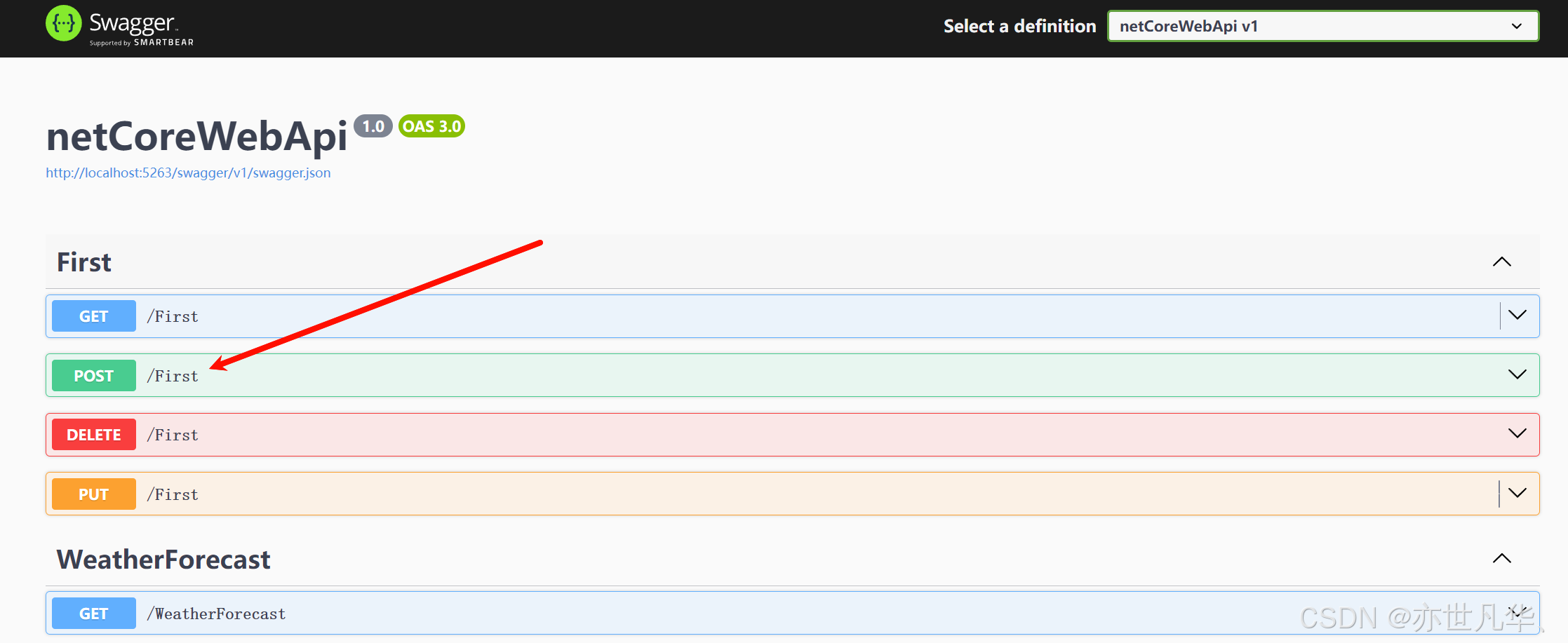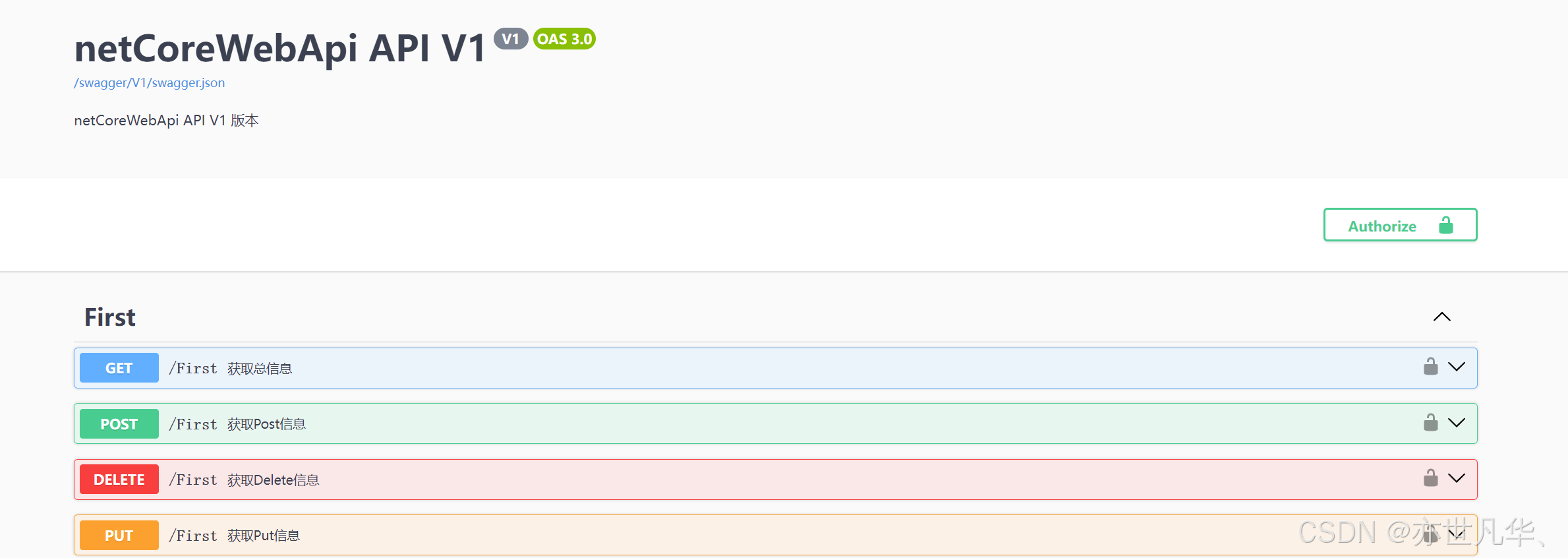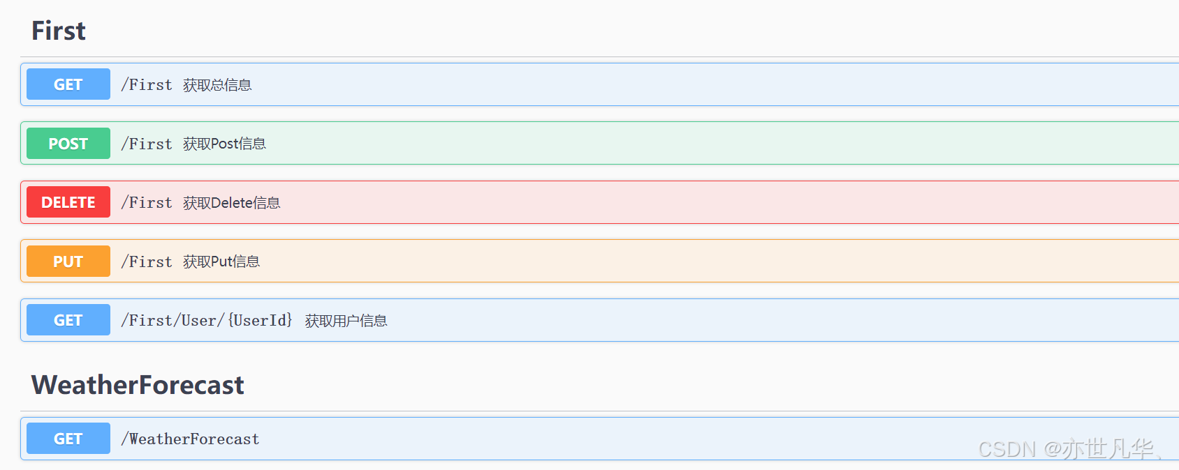 重新运行我们的项目然后打开Swagger,可以看到我们创建的一组接口成功出现了,这里接口的组名可以看到是 FirstController.cs 文件中Controller的前缀,非常好识别: