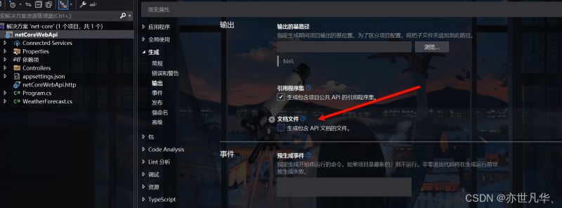 如下我们给接口代码写下注释,注释的快捷键是///,也就是三个斜杠即可生成,然后右键项目点击属性,勾选文档文件这个复选框: