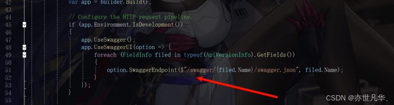 我们来到入口文件Program.cs文件处,这里我们开始设置支持Swagger版本控制的代码,这里我们借助 System.Reflection 中的FieldInfo反射机制中的类型,来获取类型ApiVersionInfo中的所有字段信息,然后通过OpenApiInfo来描述Swagger文档的元数据及包含了有关API的关键信息,比如标题、版本、描述等,如下所示: