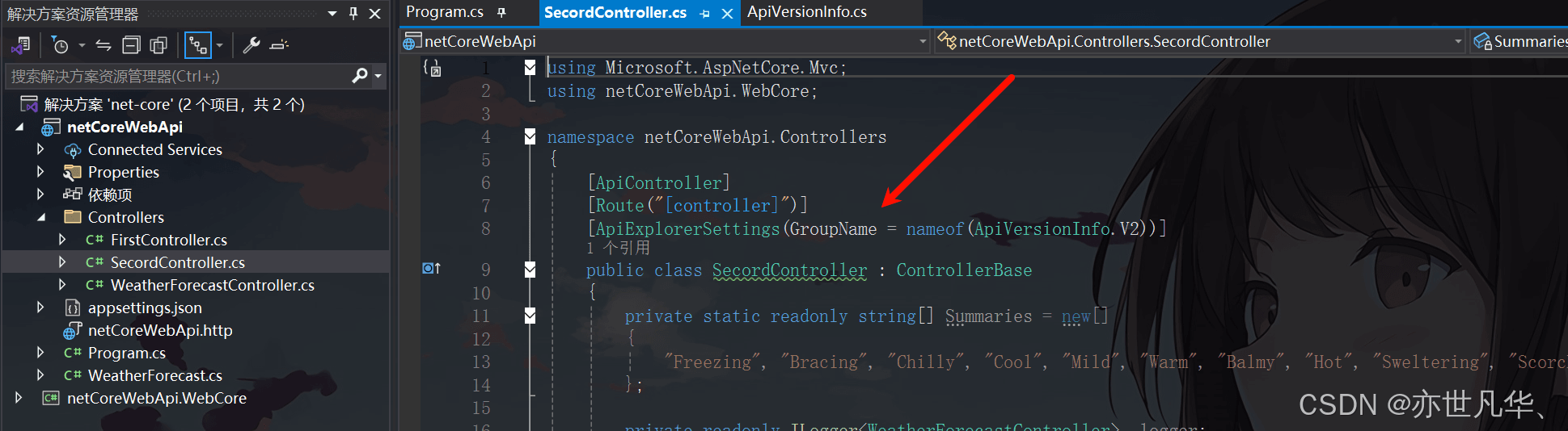 接下来我们来到编写接口代码的控制器文件,给不同版本设置如下代码,作用是将特定的API控制器或者方法标记为属于某个版本组,从而使得Swagger等工具能够按版本组织和展示API文档:
