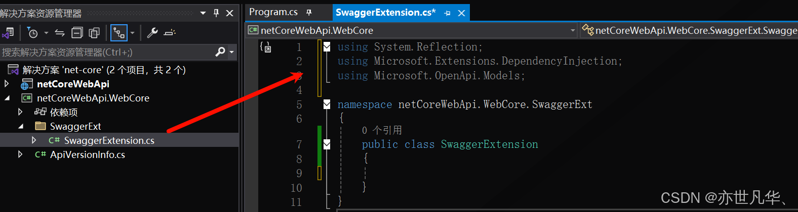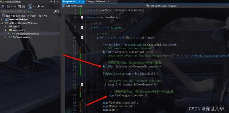 根据上面对Swagger的配置,可以看到我们对Swagger的配置基本上都写在了入口Program.cs文件当中,这样就显得非常的冗余,入口文件代码量太多了,这里我们可以将对Swagger的配置抽离到我们创建的类库当中,新建一个文件夹用于专门存放Swagger配置的东西,如下所示: