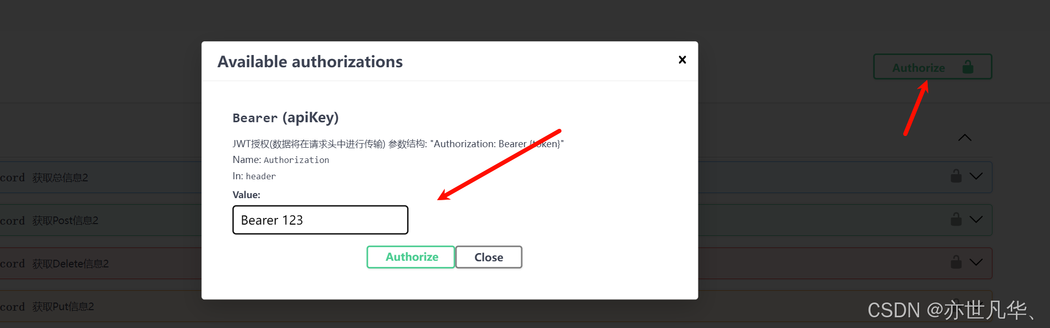 #endregion运行项目来到Swagger文档中,可以看到我们已经成功添加了身份验证,这里我们输入对应的JWT格式即可,如下所示我们输入token之后发起请求,如下已经带上了我们设置的token: