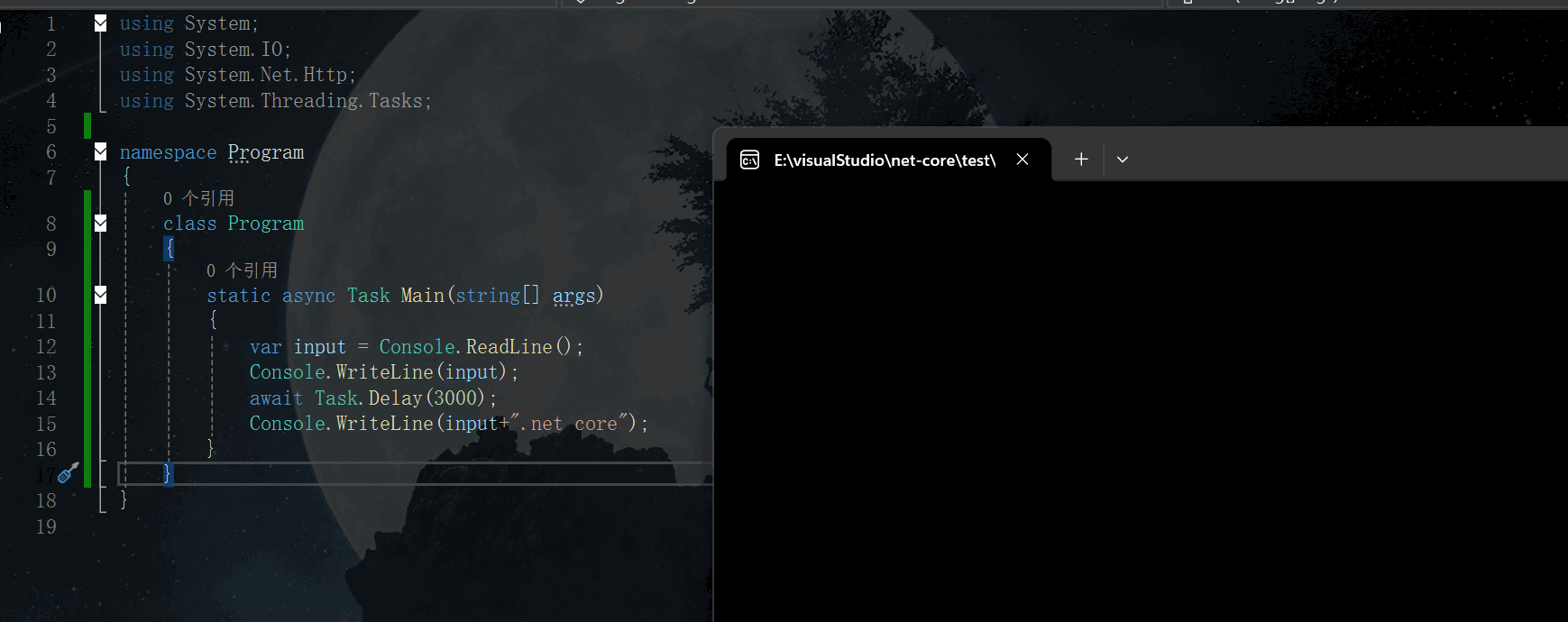 Console.WriteLine(input+".net core");