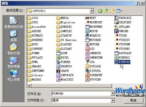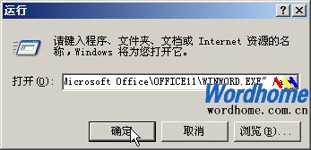 图2008070904 查找WinWord.exe程序第2步,在“打开”编辑框中的命令行最后输入/a命令开关,并单击“确定”按钮即可启动Word,如图2008070905所示。